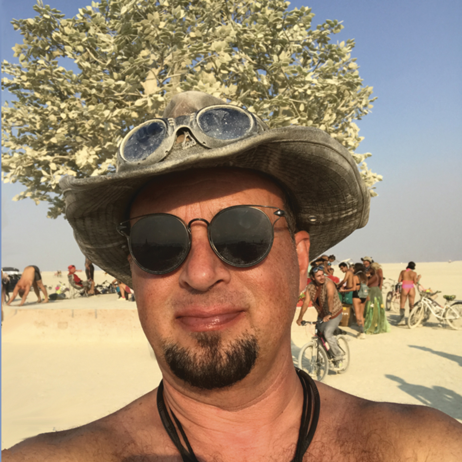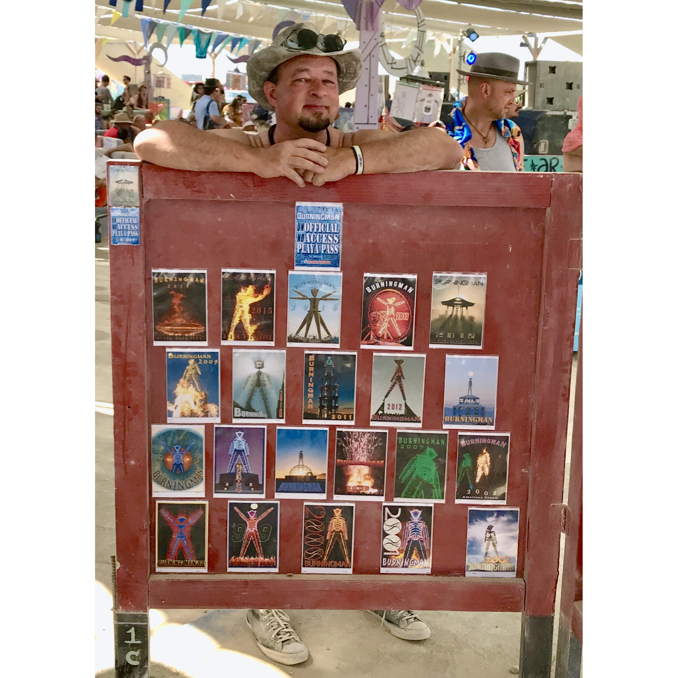 Michael Heneghan Originally from Chicago, inspired by my artistic Mother, I have always enjoyed drawing, photography and graphic design.Moved to L.A. in 1990, I first heard about Burning Man in 1997, hooked on first Burn ’98, participated 21 straight years 1998-2018 and then 2022-24.Once I finally got to Black Rock City, I found the incredible party that I expected, but what I didn’t anticipate was how I’d be inspired creatively by the amazing art and ideas. Well, I did have the intuition to create 50 laminated Playa Passes which turned out to be a big hit. They have evolved, and I’ve made them every year since. In the year 2000 I made my first stickers, and in 2016 the first of my BM bottle cap pendants. I attempted a golf cart mutant vehicle in 2002 with limited success. In 2012 I first displayed 5×7 prints of my PlayaPass collection on one of the free art boards in Center Camp, and returned to do it again almost every year, up until 2022. I look forward to many more future creations and the Burns that make them possible.