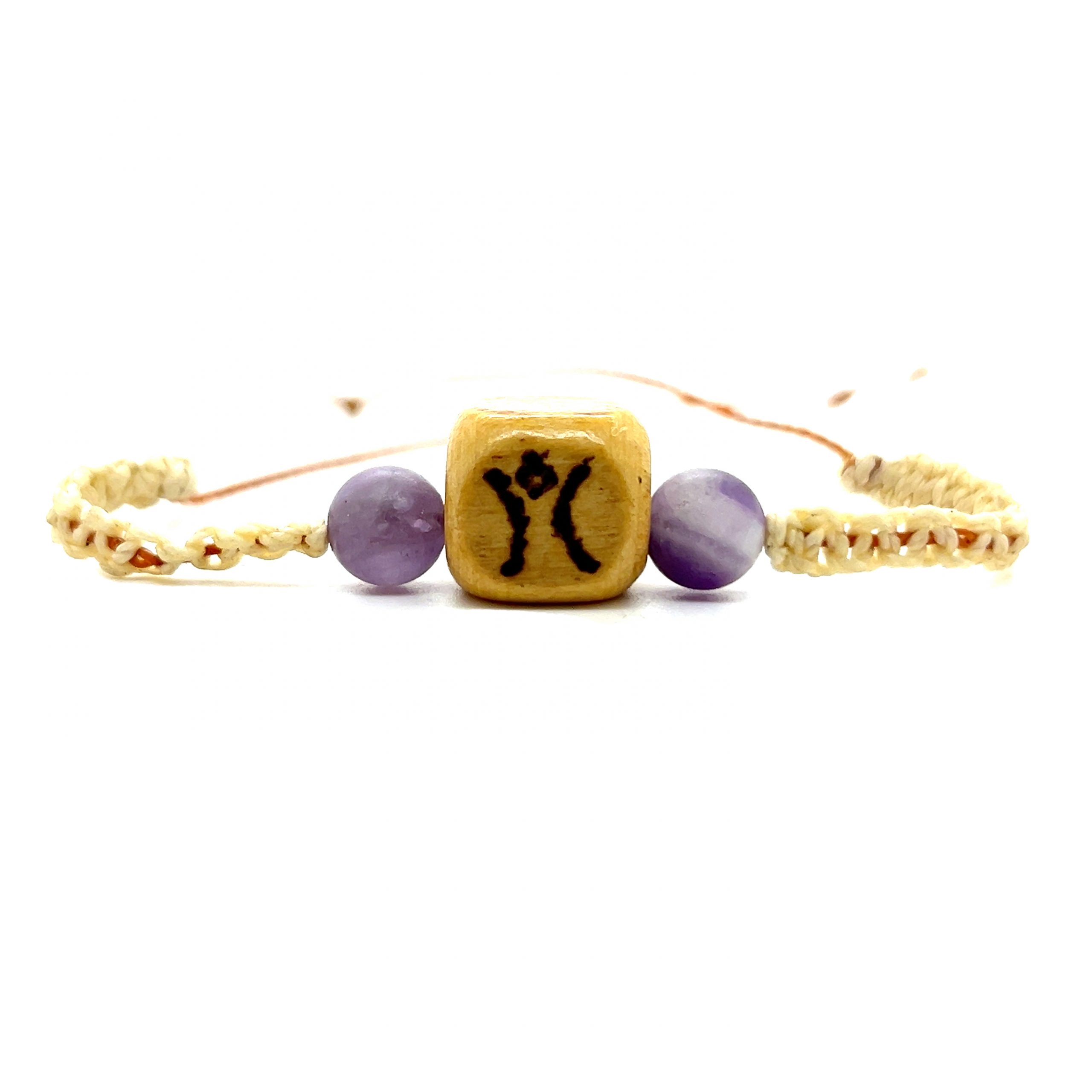 Hand made wax cord friendship bracelet with open knots, stone beads and Man Effigy on wood bead, 2023.