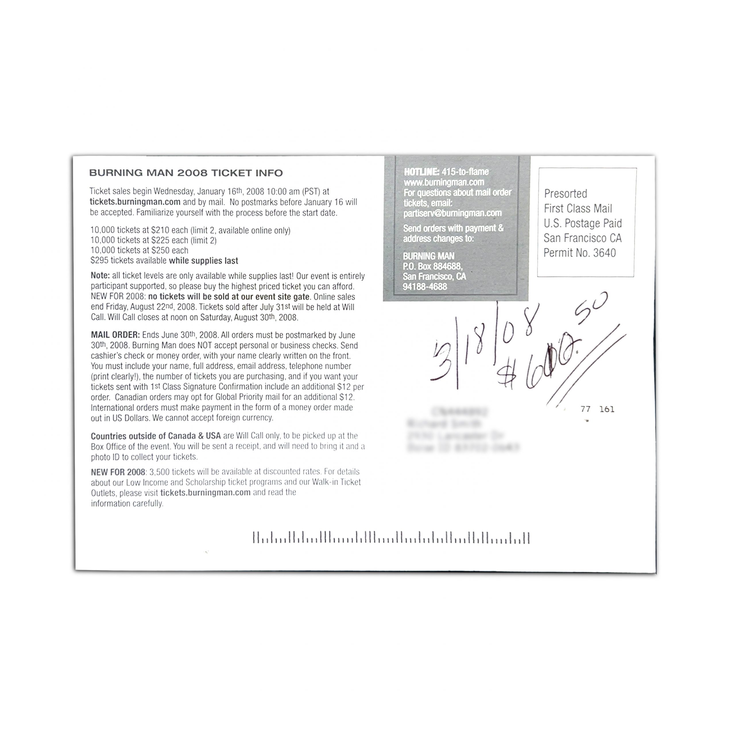 Ticket information was a simple postcard via a mailing list that Burners would sign up for. Tickets were sold in 2008 for $110 to $295 and no Parking Permit was needed at this time. 2008 was the start of Low Income, Student Scholarships and available Walk-in Ticket Outlets.