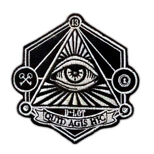 D-Lot , Quid Agis Hic, 2020 Patch by Erik Caponi. Divine Providence eye with Latin translated to “What are you doing here?”