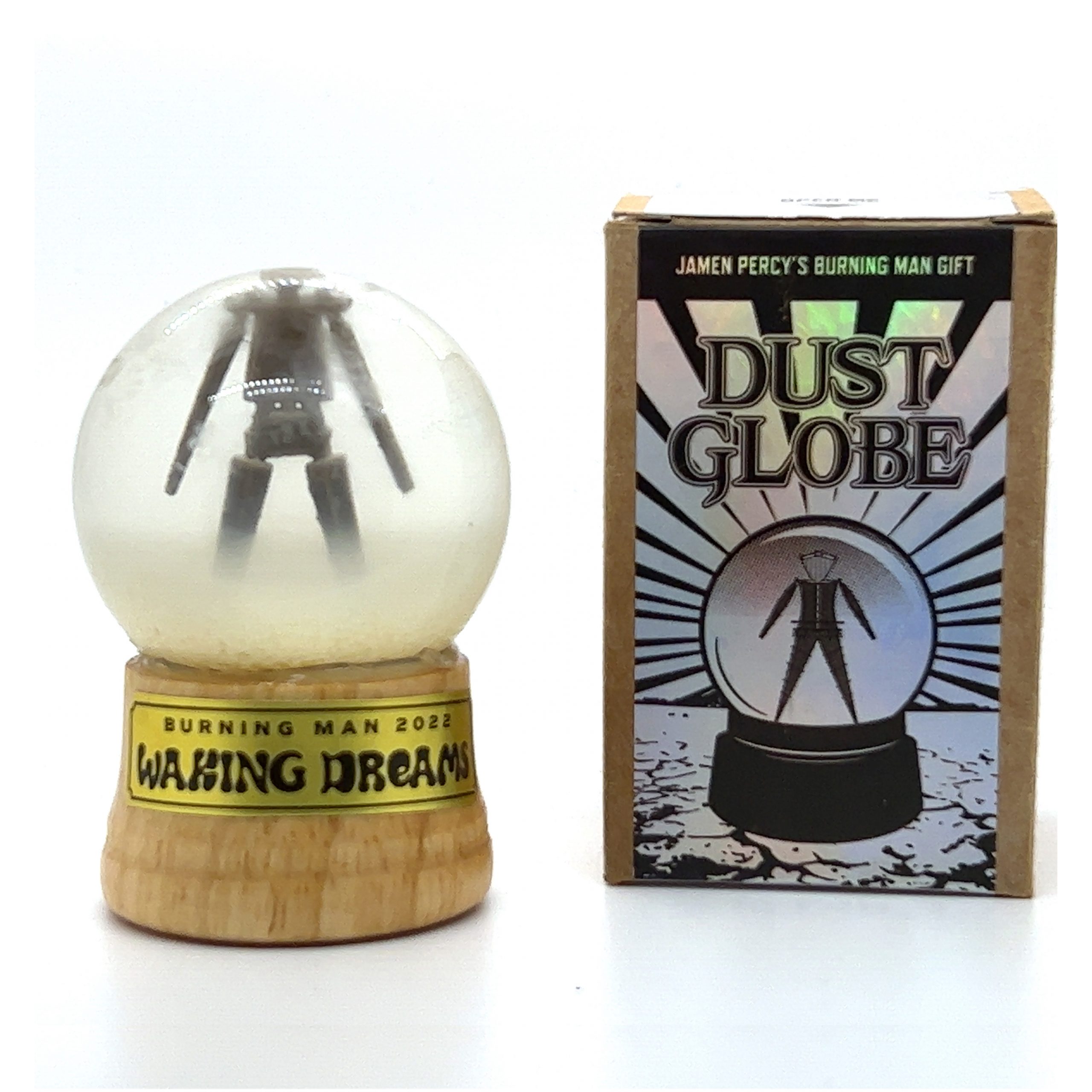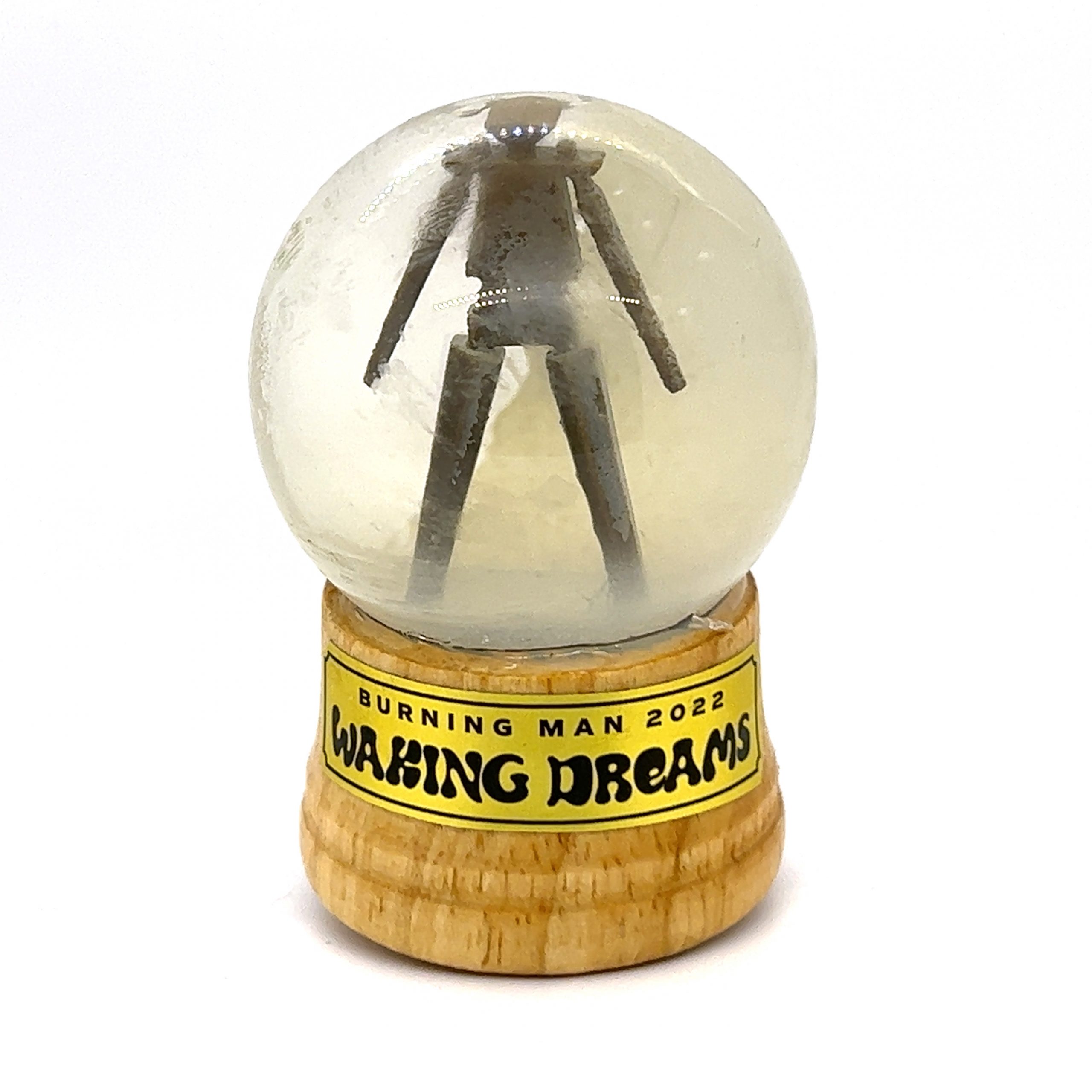 The Dust Globe Man is based on the Snow Globe concept. A small amount of Playa Dust is carefully added to each globe. Shaken it creates a whiteout dust storm indicative of the Playa. Jamen said that there was quite a lot of experimentation using the right Playa Dust and the amount to reach the final effect. Reports from others have said that some take up to a month for the whiteout to settle. Comes with a crafted box and is a Limited edition.