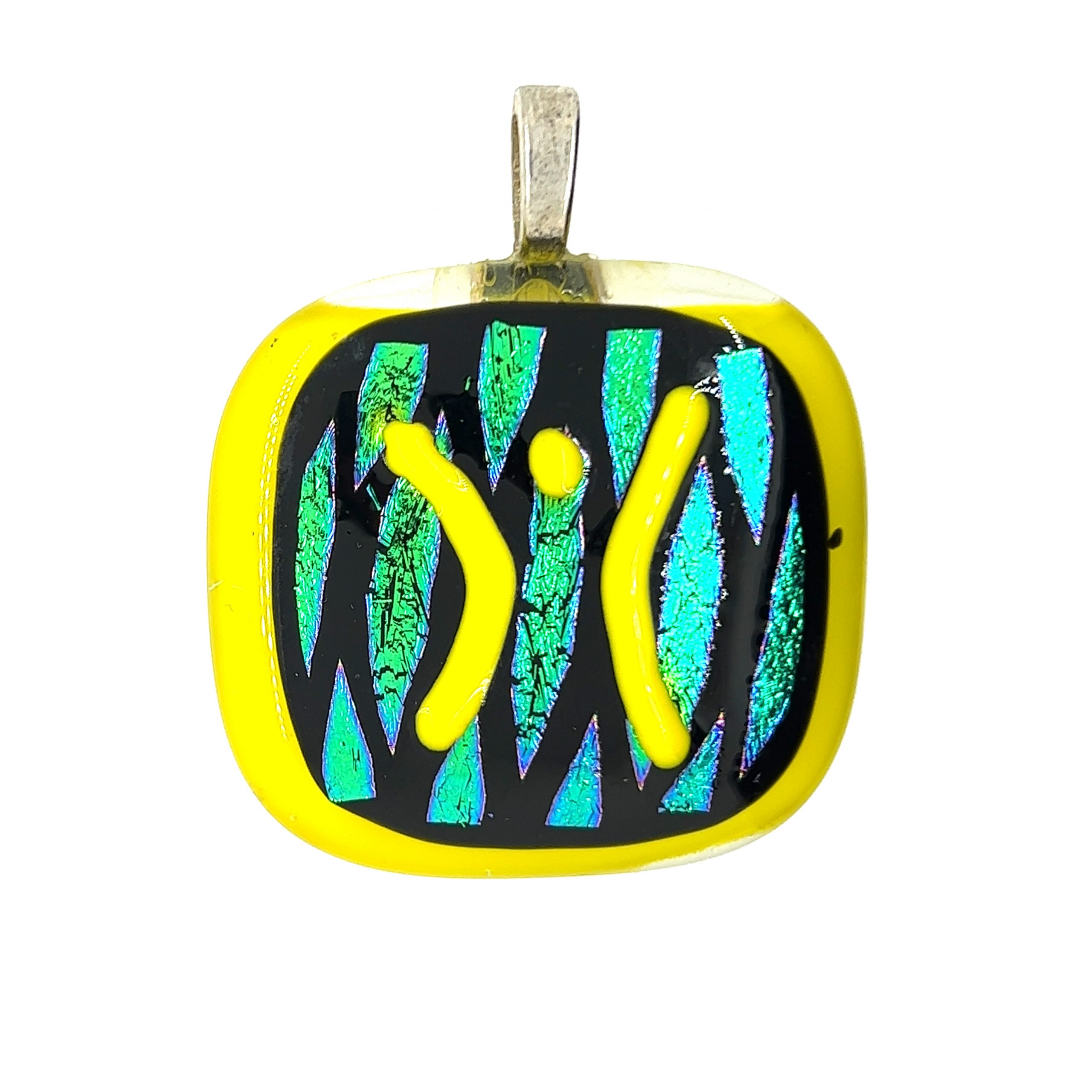 Desert Rose says, “It’s part regular colored glass and part dichroic glass.  Fused glass pendant.”