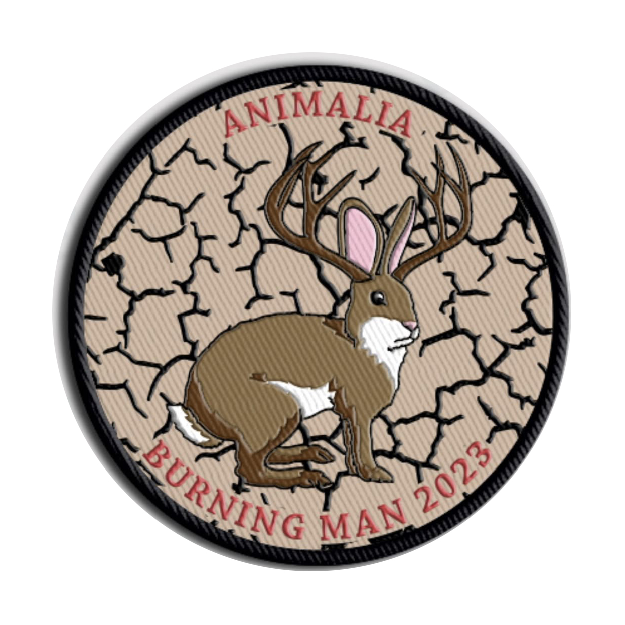 Julie writes, “I have created my 2023 patch for Burning Man. In keeping with the Animalia theme, I have decided to immortalize my personal sighting of the elusive jackalope. This particular sighting of a cross between a jackrabbit and an antelope was all the more special because it occurred on the Black Rock Desert itself. This is your chance to commemorate the sighting with your own memorabilia.”