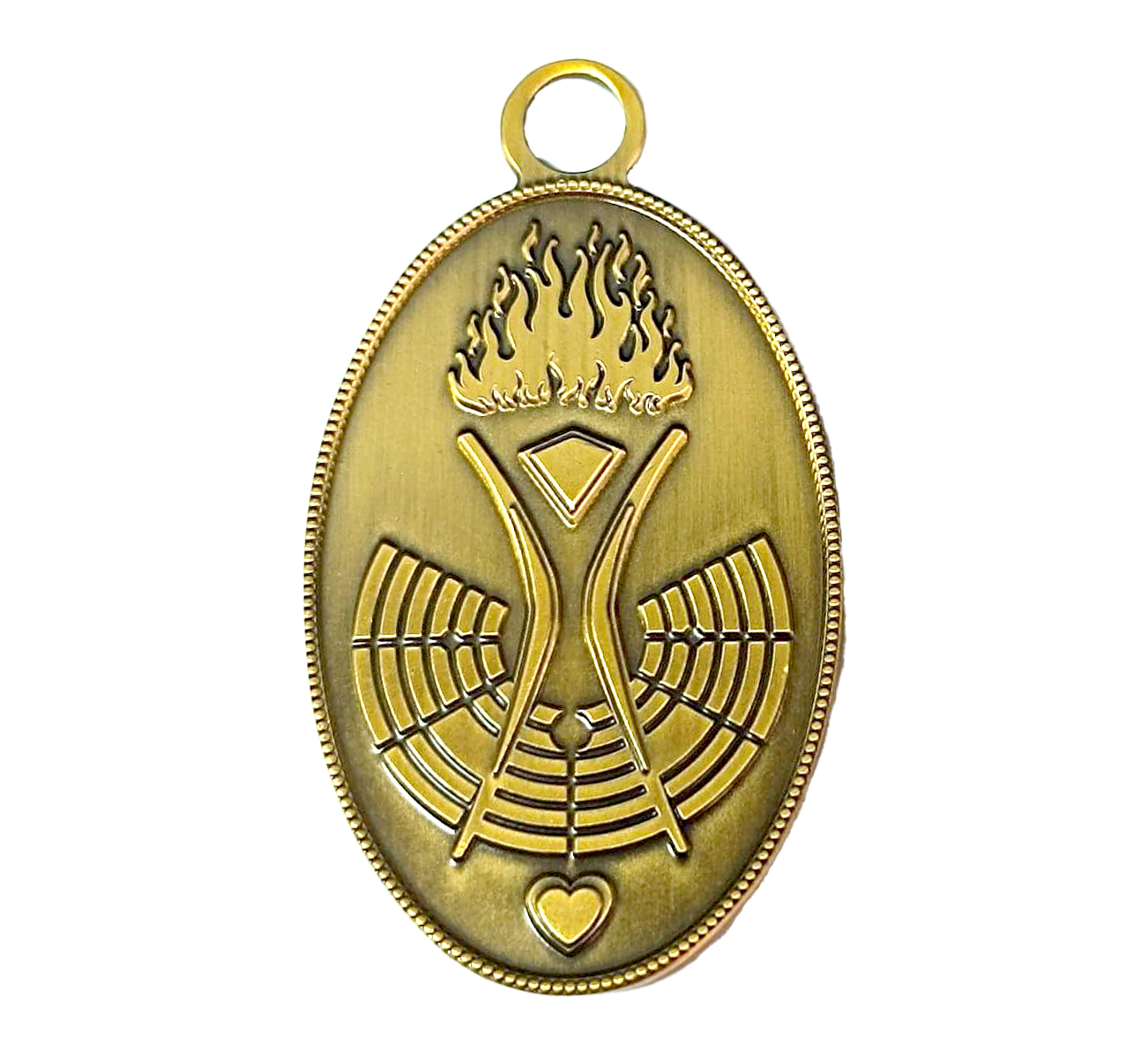 Electra QT writes, “The Flames of Burning Man Pendant was inspired by the fact that fire can destroy but also provides a new start. The pendant is made from brass with an antique finish and is just over 2” in length. The front represents fire and the back, the 10 BM principles.”