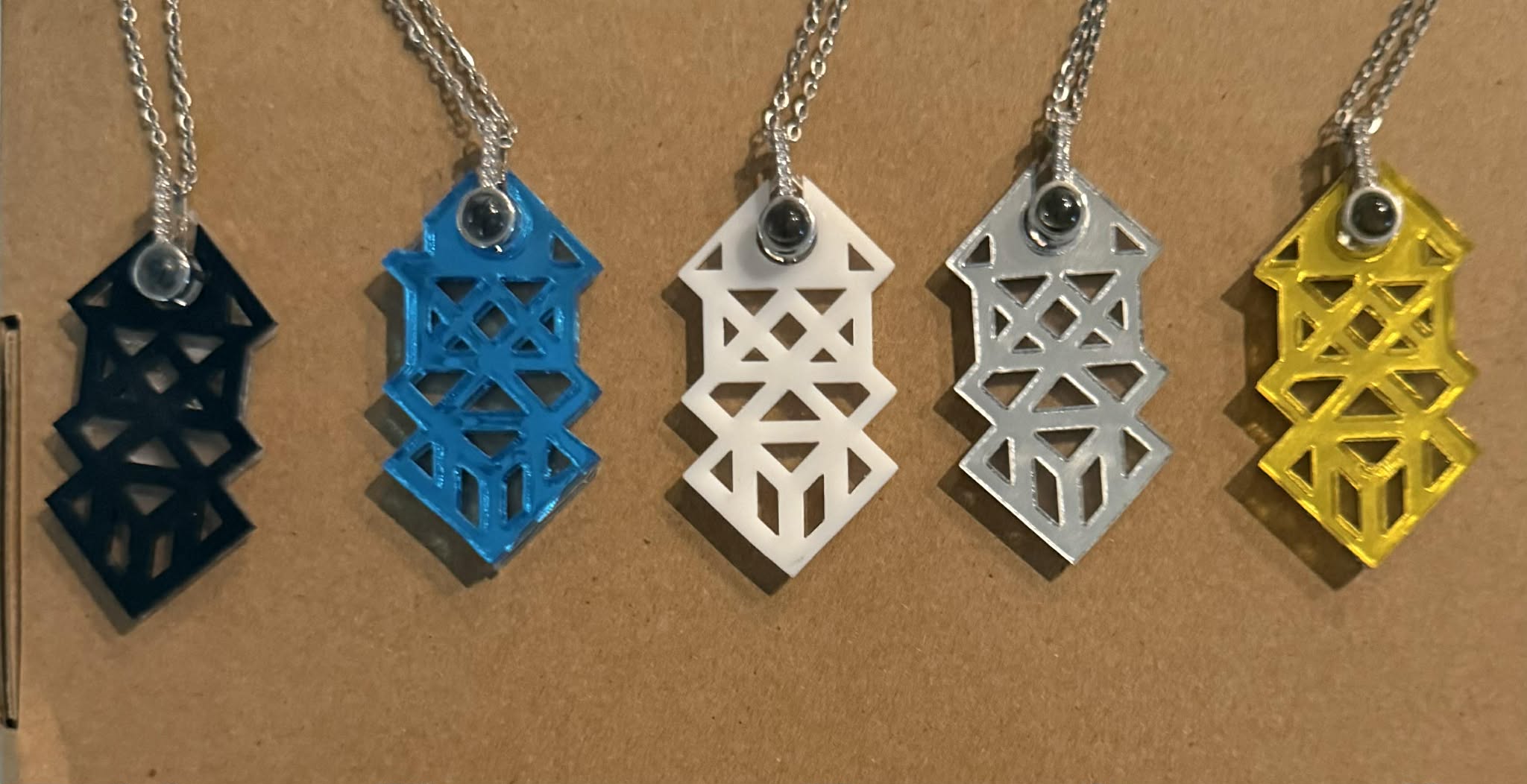 Tree of Life, 2025 Pendant by Terry Grossman. Laser cut with a Micro Lens Projector that says “Welcome Home”.