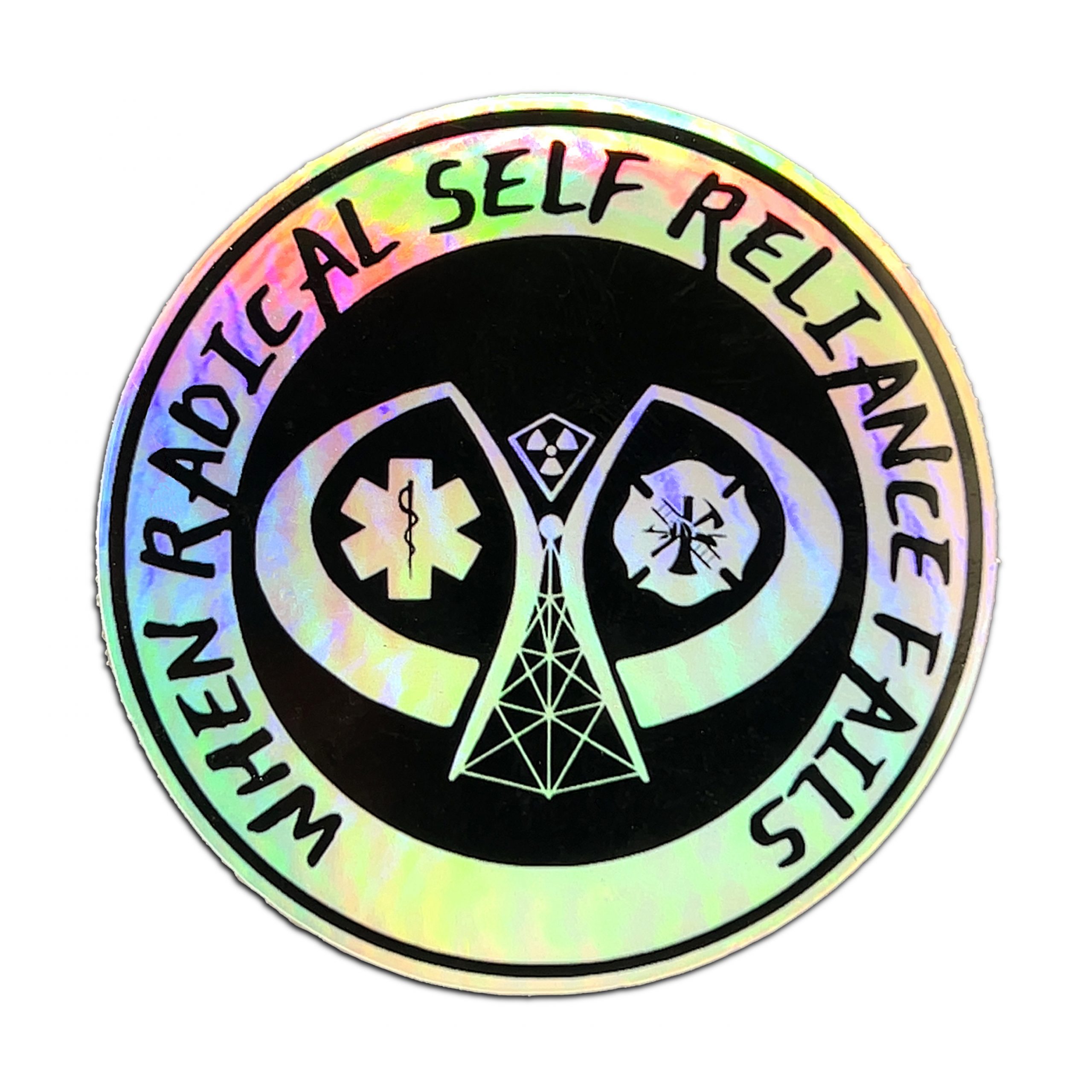 Emergency Services Department- When Radical Self Reliance Fails, 2024 Holographic Sticker by Crystal Richard.